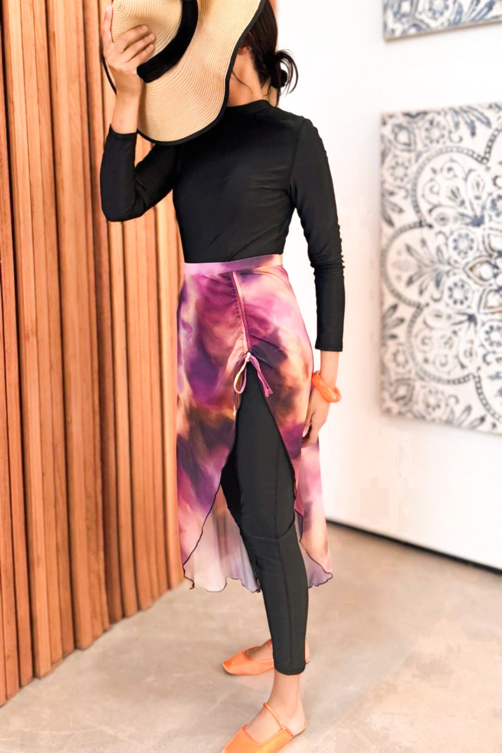 Un noir intense relevé d’une jupe violette fluide. Idéal pour celles qui veulent rester discrètes tout en ajoutant une touche de couleur.