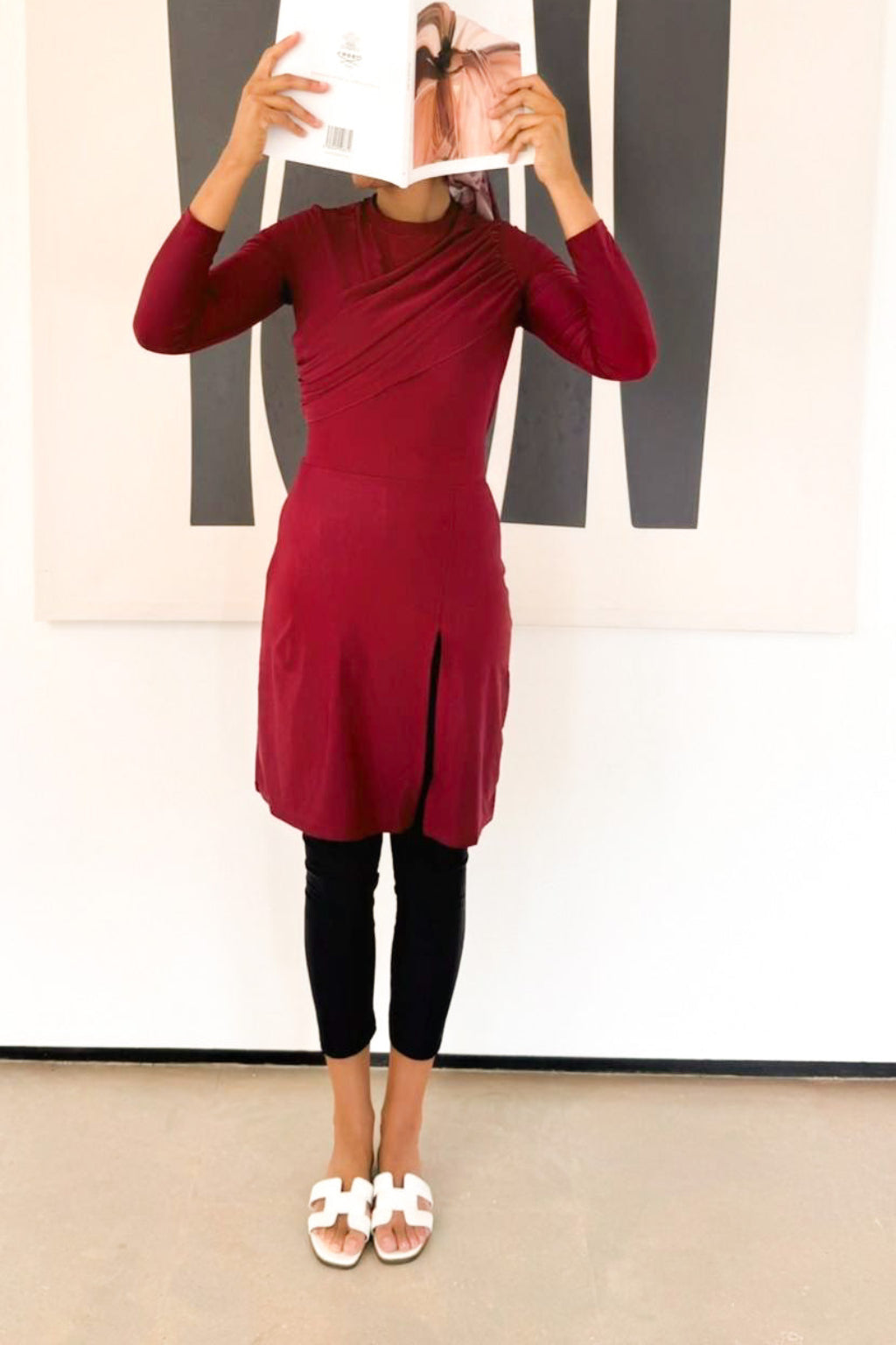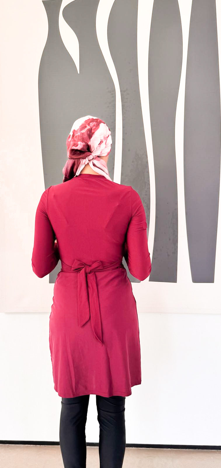 Un rouge lumineux qui flatte toutes les carnations. Ce modèle deux pièces est complété par une sur-jupe transparente élégante, pour une silhouette féminine mais discrète.