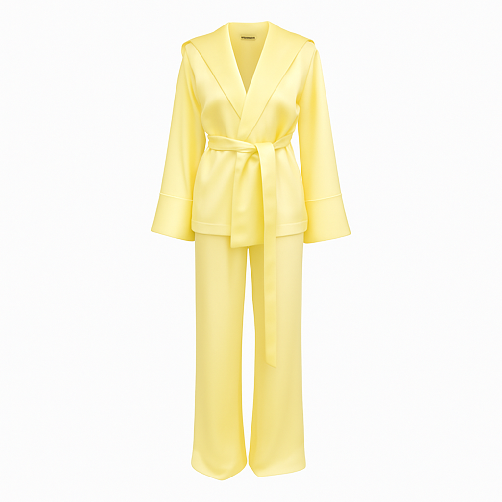 Un ensemble deux pièces ultra élégant composé d’une veste cache-cœur ceinturée et d’un pantalon fluide. Une tenue lumineuse, chic et confortable, idéale aussi bien pour une soirée que pour un homewear très raffiné.